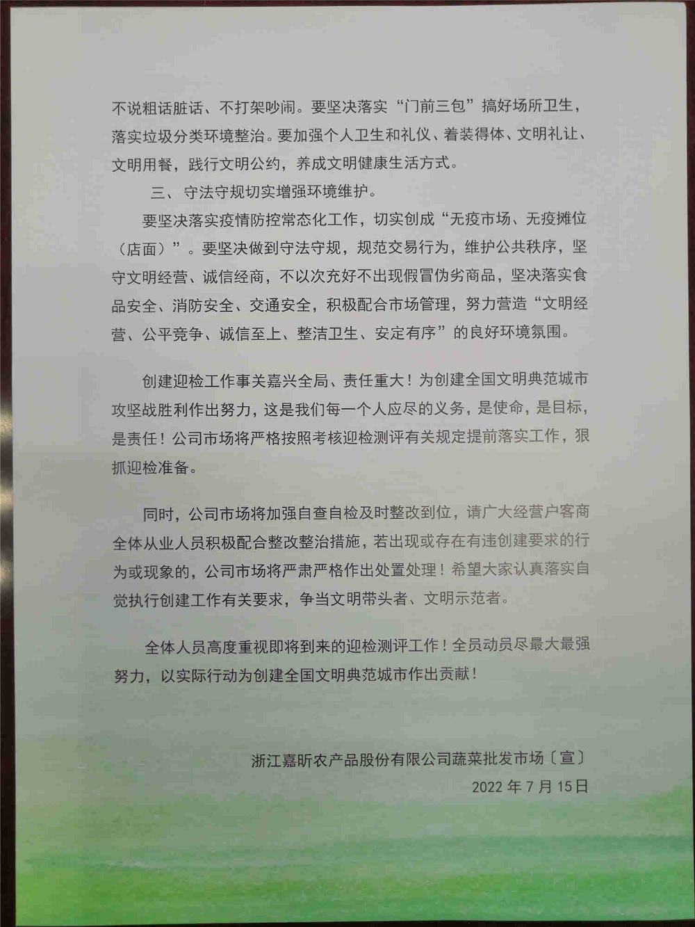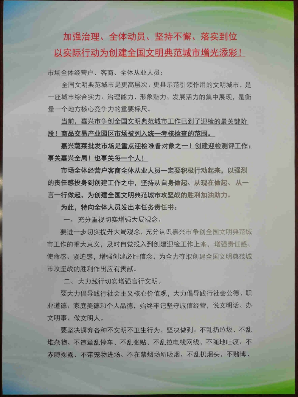 當(dāng)前,嘉興市爭創(chuàng)全國文明典范城市工作已到了最關(guān)鍵的迎檢階段,創(chuàng)建迎檢測評工作事關(guān)全局,也事關(guān)著每一個(gè)人。公司市場高度重視創(chuàng)建工作,加強(qiáng)治理、全體動(dòng)員,攻堅(jiān)克難,按照上級(jí)要求、對照測評標(biāo)準(zhǔn),狠抓思想發(fā)動(dòng)、狠抓弱薄整治、狠抓交易秩序、狠抓現(xiàn)場面貌,以久久為功的決心和行動(dòng)全力為創(chuàng)建加分而努力。