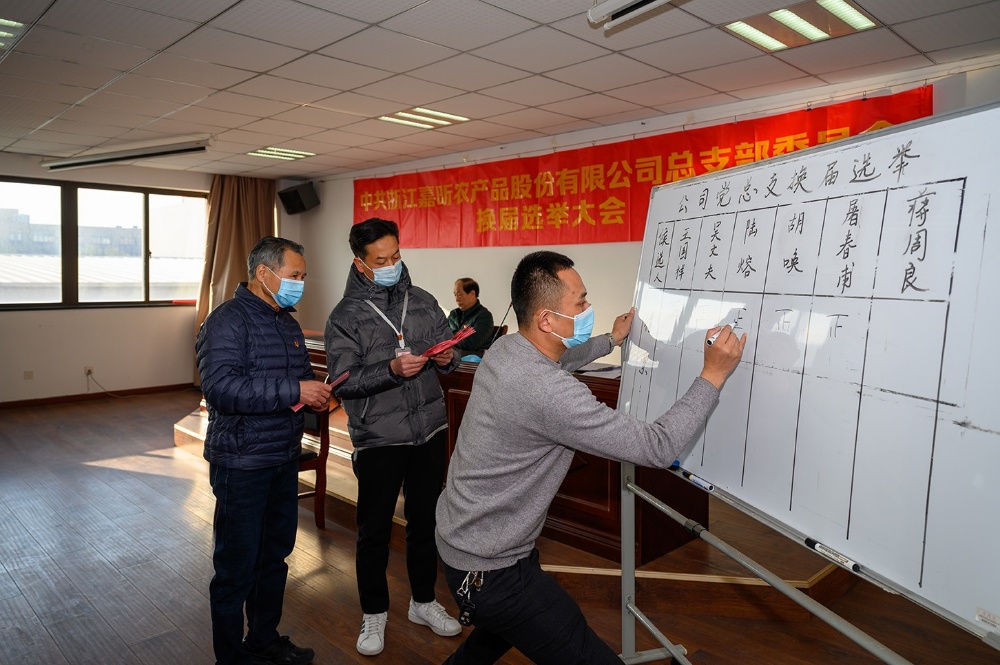 2021年12月27日上午,浙江嘉昕農產品股份有限公司黨總支隆重召開黨員大會進行總支委換屆選舉工作,選舉產生新一屆(第七屆)總支委班子。會議由公司黨總支書記屠春甫主持。