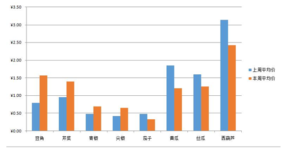 豆角環(huán)比上漲96.43%、芹菜環(huán)比上漲46.27%、青椒環(huán)比上漲44.12%、尖椒環(huán)比上漲53.33%,價(jià)格上漲明顯,原因:雖然豆角、青椒、尖椒屬于時(shí)令蔬菜,但由于季節(jié)性原因,此類蔬菜上市量開始逐漸減少,尤其豆角上市量驟降,造成價(jià)格驟增,另外由于上上周天氣以多雨為主,對(duì)于青椒影響較大,造成部分損壞,進(jìn)而價(jià)格上漲。